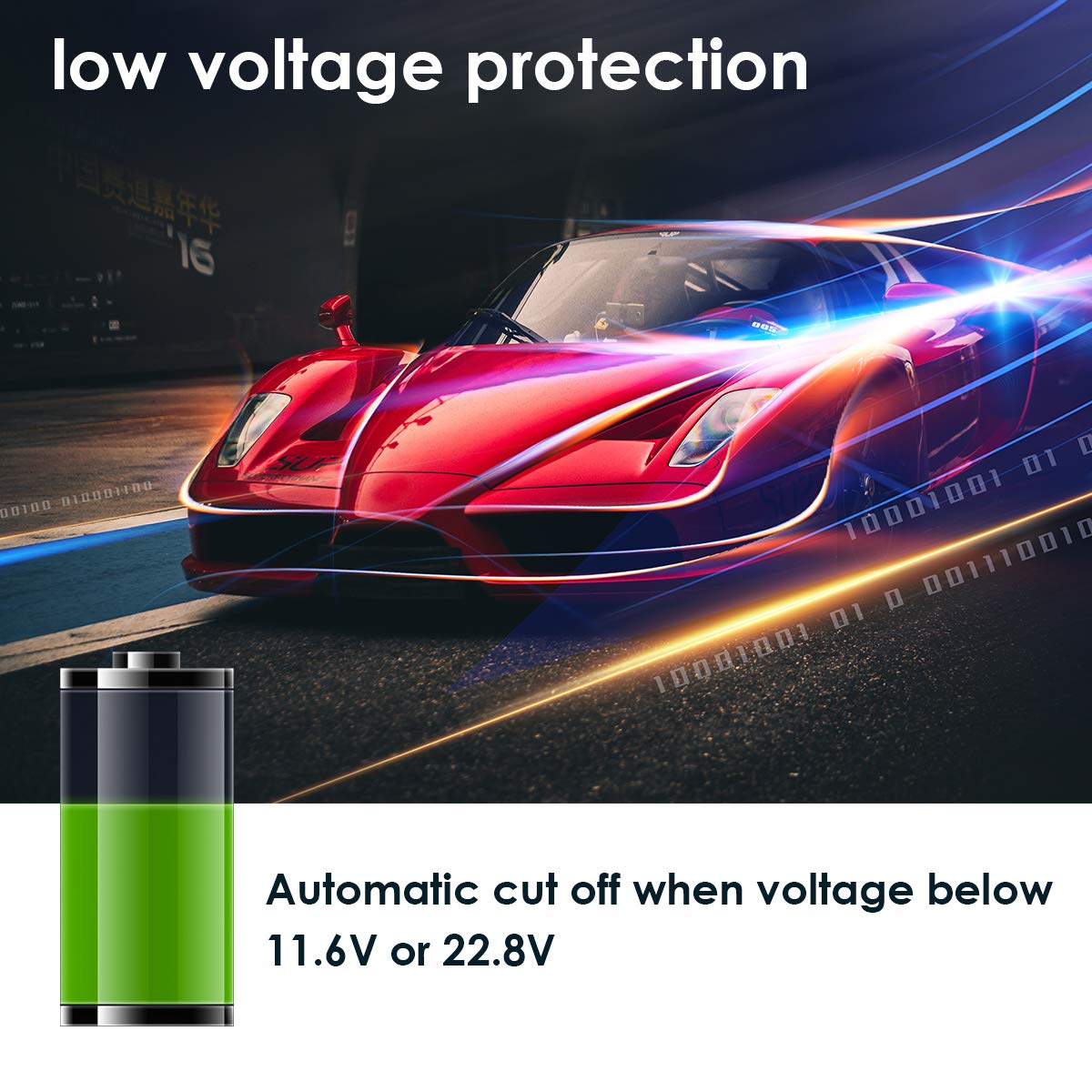 Low Voltage Protection: 11.6V for 12V vehicle; 22.8V for 24V vehicle.