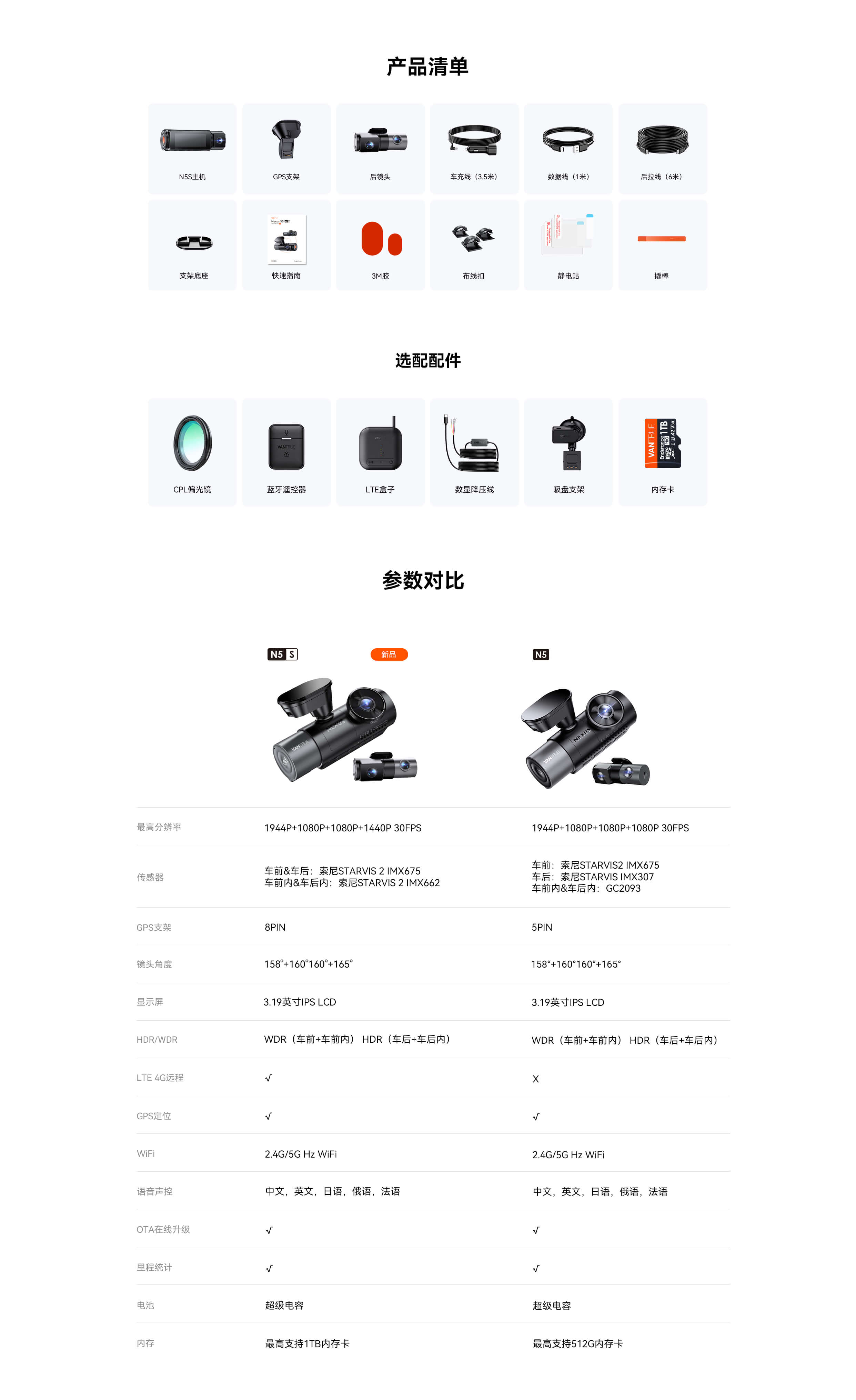 | Resolution | Dual:1920*1080 30fps, Single Front 1920x1080 60fps or 2560x1440 30fps | Dual:4K+1080P@30fps, Single Front:4K 2160P@30fps/1440P@60fps/1080P@120FPS | 1920x1080 30fps | Three Way: 1440P+1080P+1080P Dual: 1440P+1080P Single Front: 1520P | Dual:1920x1080 30fps, Single Front 2880*2160P 24fps or 1920*1080P 60fps | Dual: 1440P + 1080P 30FPS |